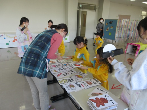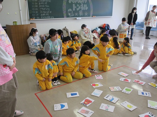 「へんしんトンネル」という絵本を読んでもらった後、2枚のカードを持って変身トンネルをくぐり、新しい言葉を作るゲームやカードをひっくり返して自分たちのチームの色にするゲームを楽しみました。とても盛り上がり、「もっとやりたい!」との声が上がりました。