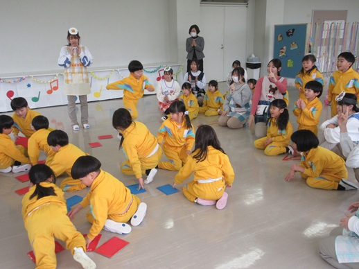 初めは大きい建物に戸惑った様子でしたが、学生さんたちが優しく声を掛けて、手遊びをしてくれました。