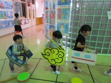 ホールには、線路が引かれて電車ごっこを楽しみました。途中には踏み切りがあって遮断機が上がったら出発です。