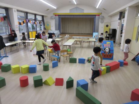 お遊戯室は、巨大迷路になりました。途中、行き止まりがいっぱいでしたが、迷わずに進んでトンネルをくぐったらゴールです。