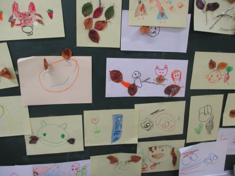 にじの部屋では、葉っぱを使ったお絵描きコーナー、長い紙にみんなで描いたり、一人一人製作を楽しんだりしました。