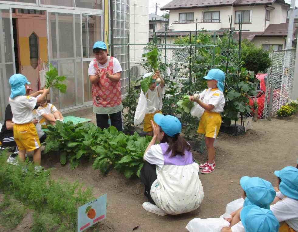 幼稚園の特色 幼稚園の紹介 年間の行事 預かり保育 未就園児教室 メニュー閉じる 幼稚園の特色 幼稚園の紹介 年間の行事 預かり保育 未就園児教室 園のブログ 野菜の収穫2 2024.07.17 幼稚園の中庭で育てている野菜が大きくなりました。年長組は、育てていたかぶが大きくなったのでみんなで収穫しました。葉っぱがついたまま一人1個ずつ持ち帰りました。 年中組では、育てっているキュウリを収穫して、小さく切ってみんなで食べました。 一覧に戻る よくあるご質問 お問い合わせ 【所在地】〒981-3215 仙台市泉区北中山二丁目6-3【TEL】022-376-4821
