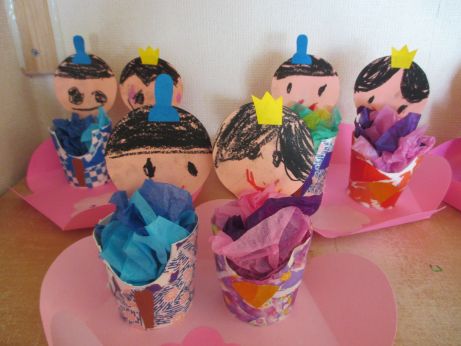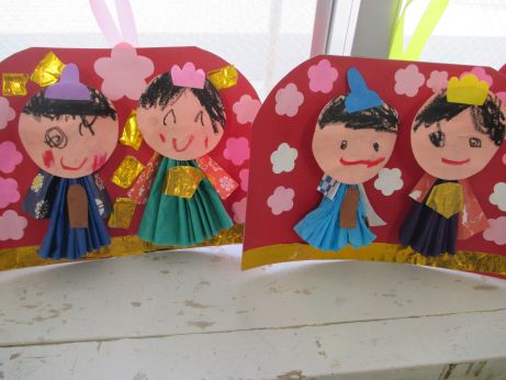 年長組では、台の上に座っているひな人形を作りました。