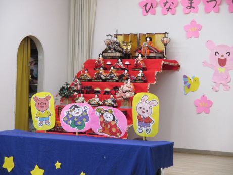 お遊戯室にひな人形を飾ってひなまつり会をしました。