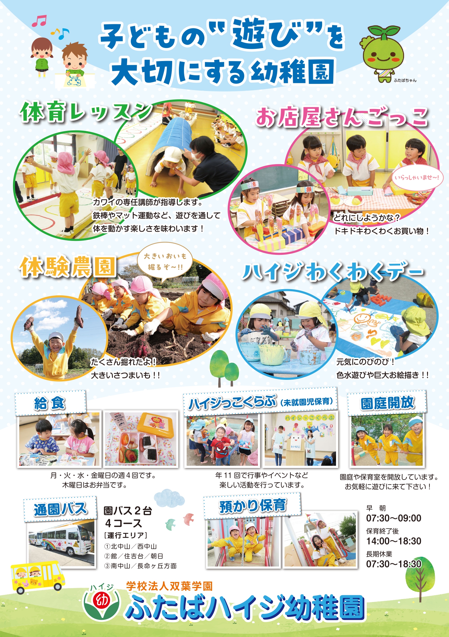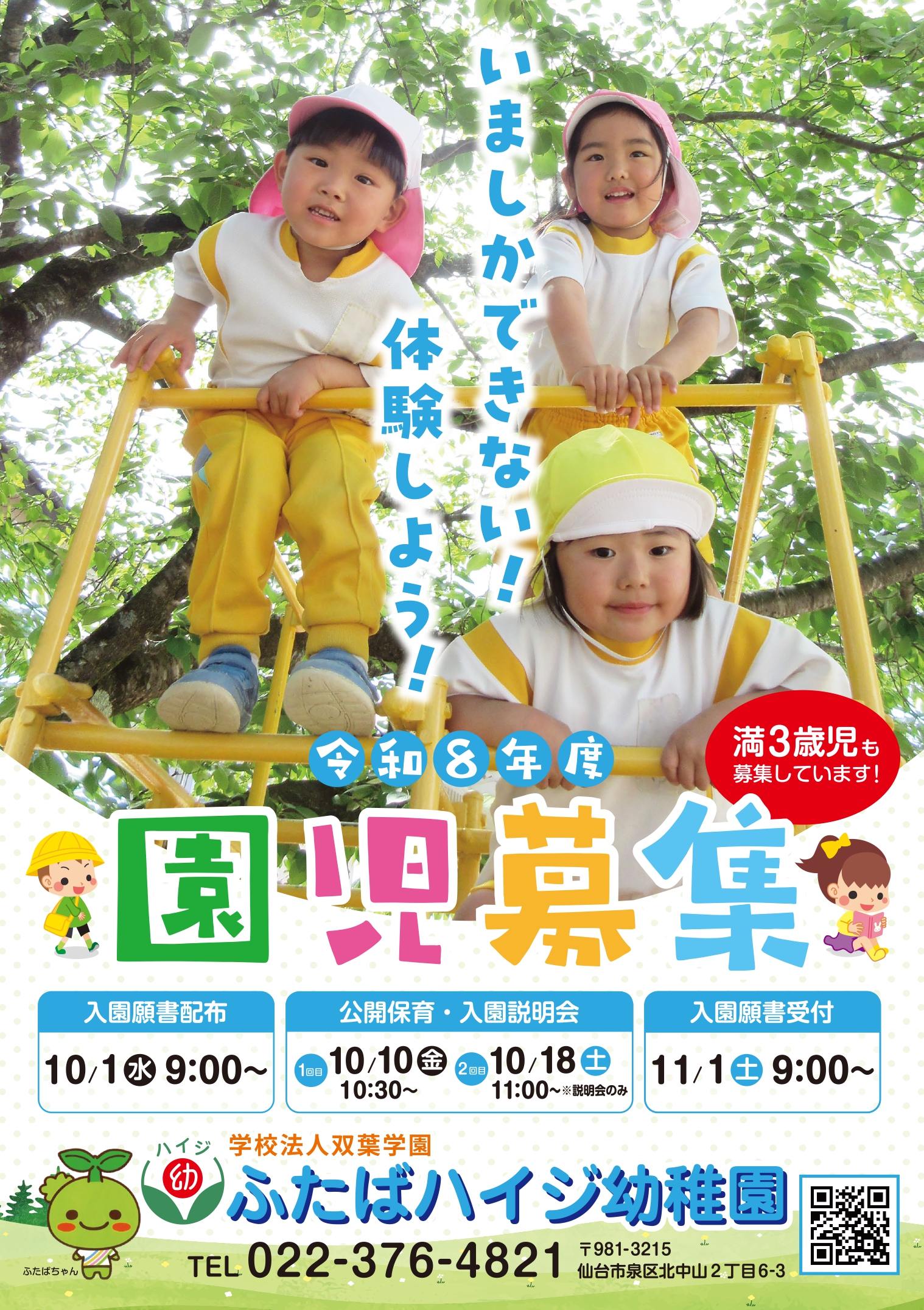 幼稚園の特色 幼稚園の紹介 年間の行事 預かり保育 未就園児教室 メニュー閉じる 幼稚園の特色 幼稚園の紹介 年間の行事 預かり保育 未就園児教室 お知らせ 令和8年度 園児募集 お知らせ2025.10.02 令和8年度 入園願書を配布しています 1 入園願書の配布 〇10月1日(水)9時から入園願書配布しています。 2 入園説明会・公開保育 〇1回目 10月10日(金) 10:15~受付 10:30~入園説明会 11:00~公開保育 〇2回目 10月18日(土) 10:00~ハイジっこくらぶ 11:00~入園説明会 3 入園願書の受付 〇11月1日(土)9:00~ 4 その他 幼稚園見学は随時受け付けております。 ぜひ、幼稚園までご連絡ください。 一覧に戻る よくあるご質問 お問い合わせ 【所在地】〒981-3215 仙台市泉区北中山二丁目6-3【TEL】022-376-4821