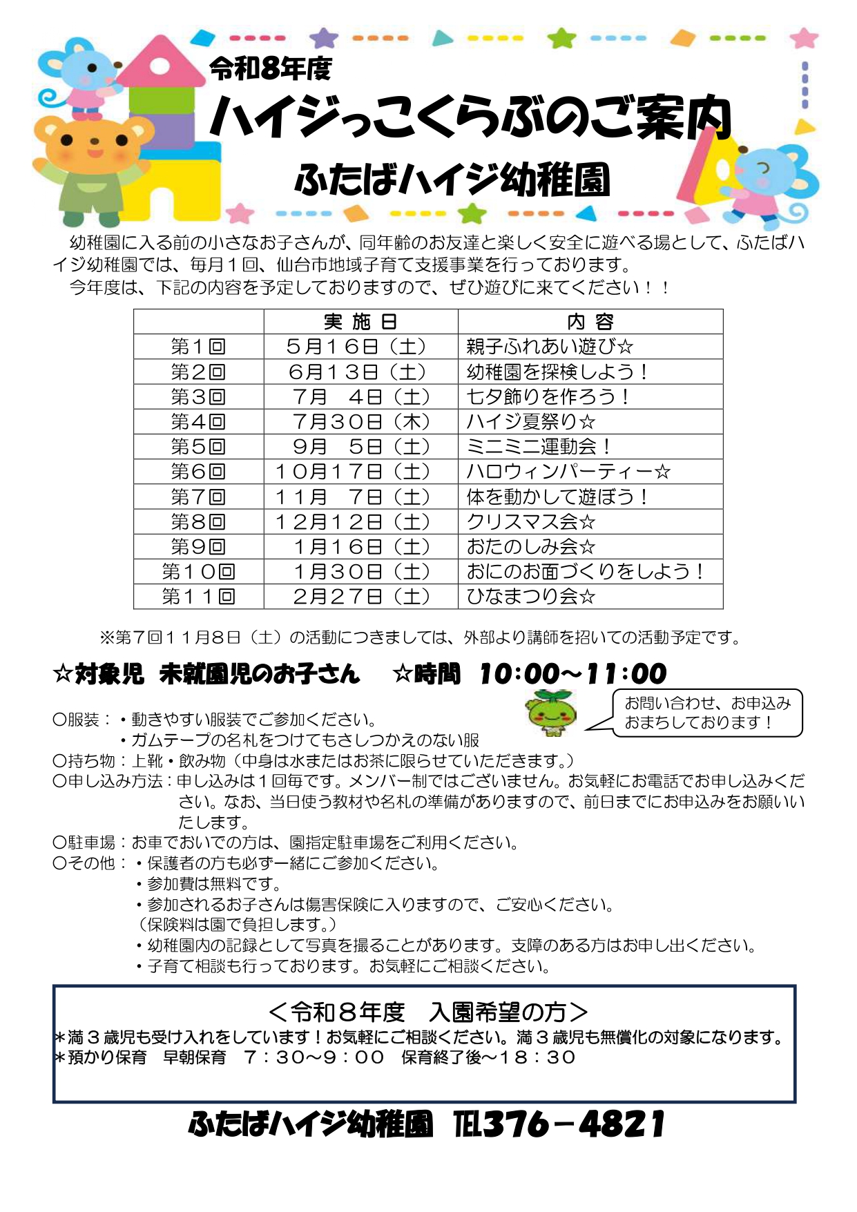 令和8年度ハイジっこくらぶの年間計画です。ぜひ遊びに来てくださいね。