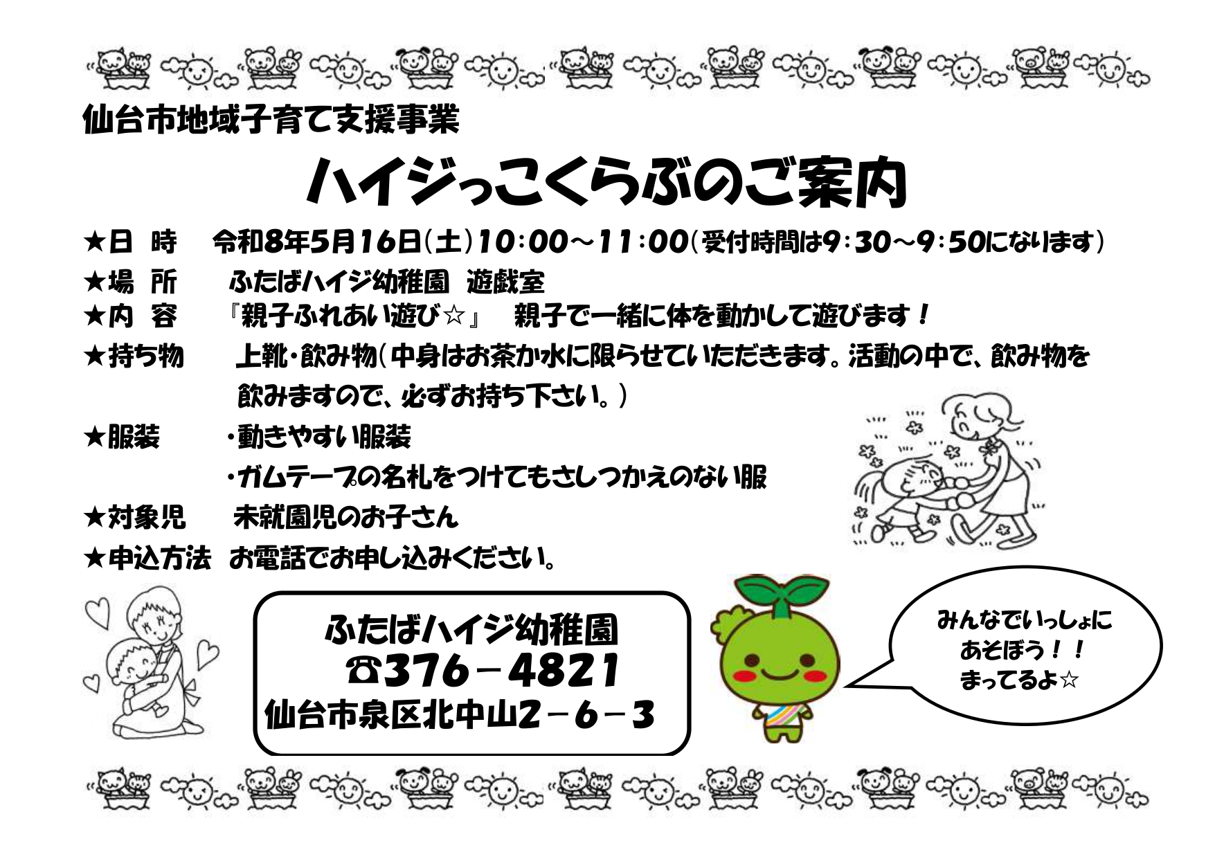 幼稚園の特色 幼稚園の紹介 年間の行事 預かり保育 未就園児教室 メニュー閉じる 幼稚園の特色 幼稚園の紹介 年間の行事 預かり保育 未就園児教室 お知らせ 5月のハイジっこくらぶのご案内 お知らせ2026.04.20 5月のハイジっこくらぶは「親子ふれあい遊び☆」です。親子で一緒に楽しく遊びます。ぜひいらしてください。 一覧に戻る よくあるご質問 お問い合わせ 【所在地】〒981-3215 仙台市泉区北中山二丁目6-3【TEL】022-376-4821